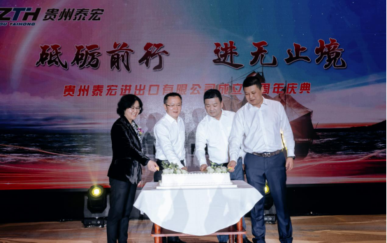 重慶市中基進(jìn)出口有限公司董事長(zhǎng)蒲洪友、總經(jīng)理劉華、副總經(jīng)理張哲、貴州泰宏總經(jīng)理王宇共同進(jìn)行了切蛋糕儀式